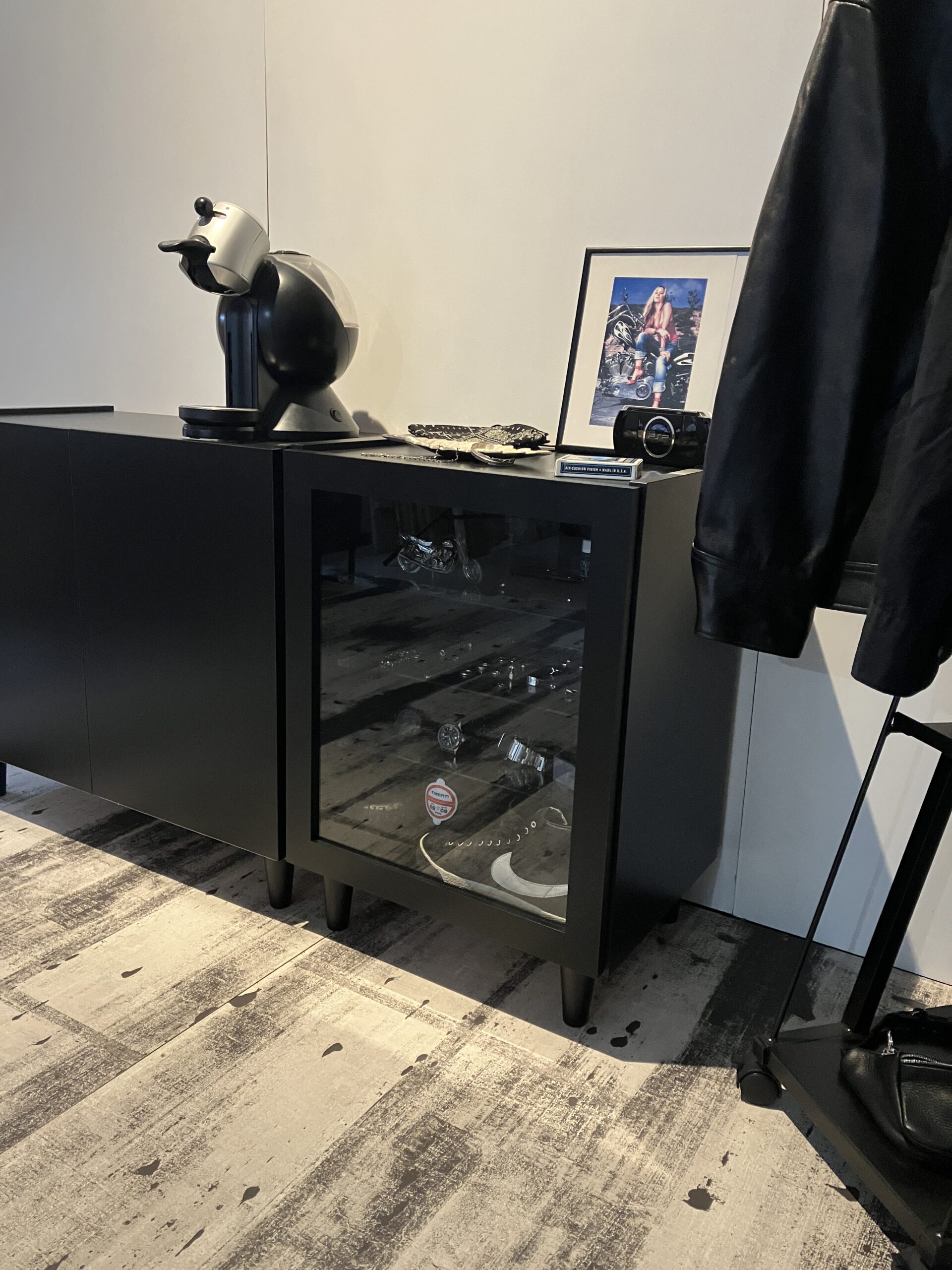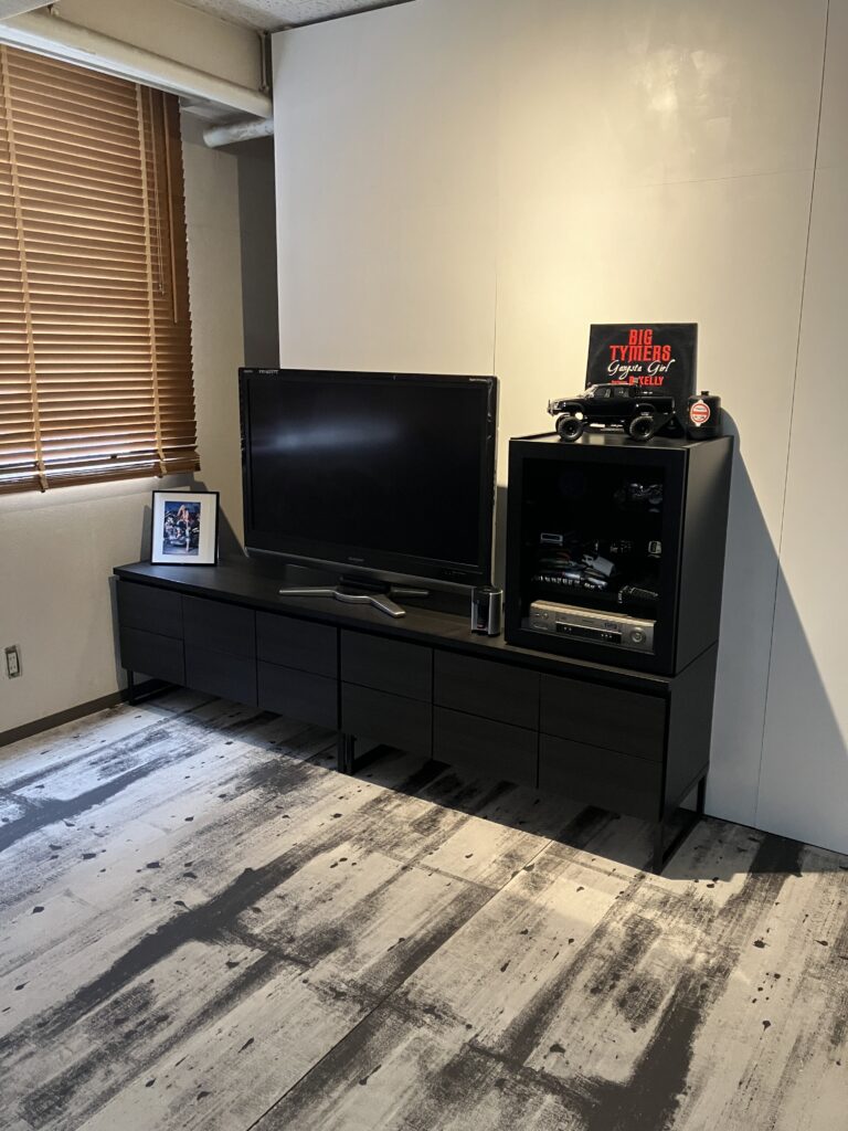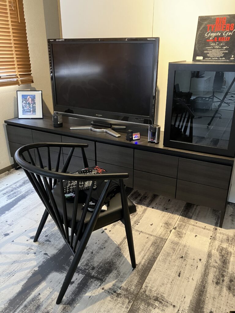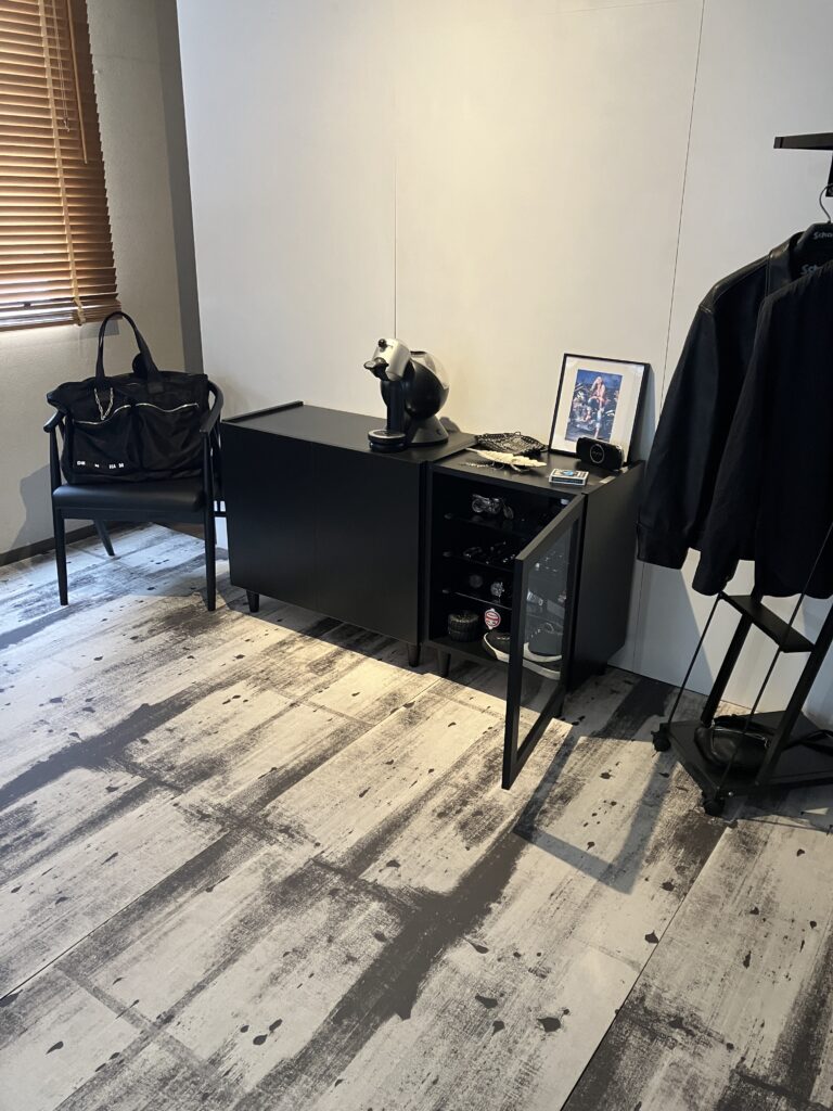 これまたオールブラックで仕上がったカッコよすぎる雰囲気。ディスプレイに私物も狩り出され撮影に挑み、終始撮影クルーに指示だししておりました。まあ、カメラマンのBobさんもストリートカルチャーは好物なので、雰囲気撮りはオテノモノ。スムーズに進行できました。